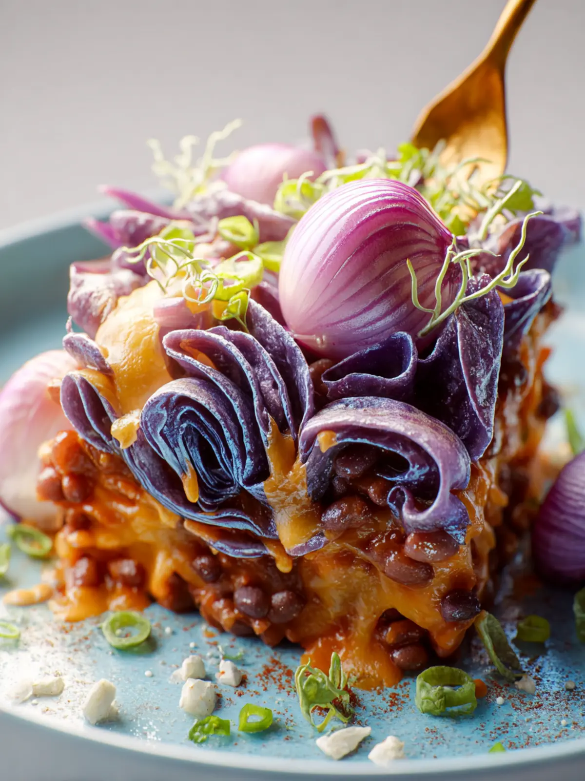 - Rest for 5 minutes before serving. Garnish with sliced red onion, green onion, and optional cilantro. Slice into 12 pieces and serve.