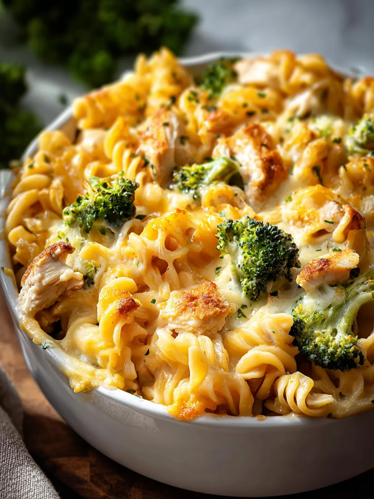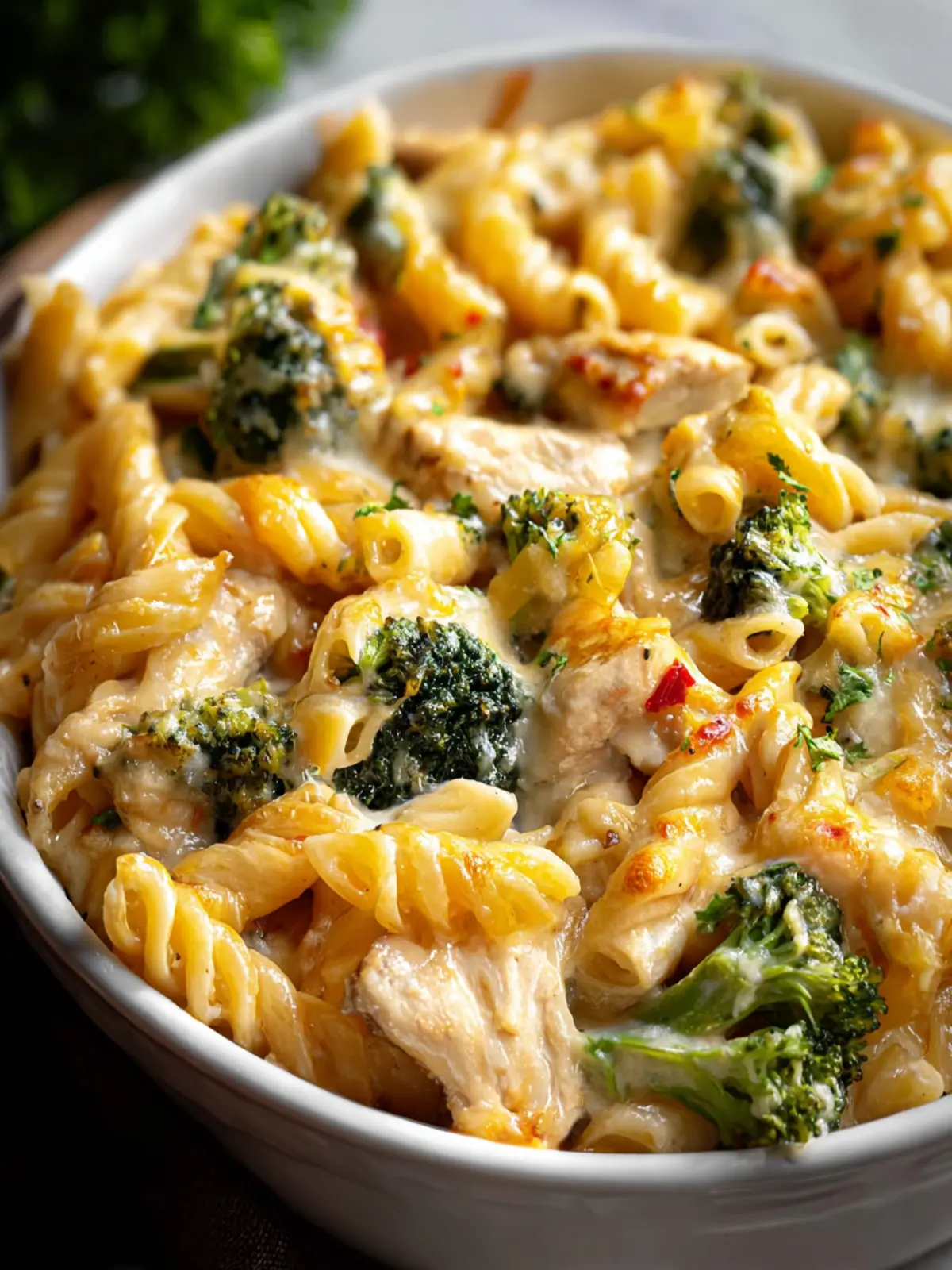 A comforting and delicious baked pasta dish featuring chicken, broccoli, and a blend of cheeses.