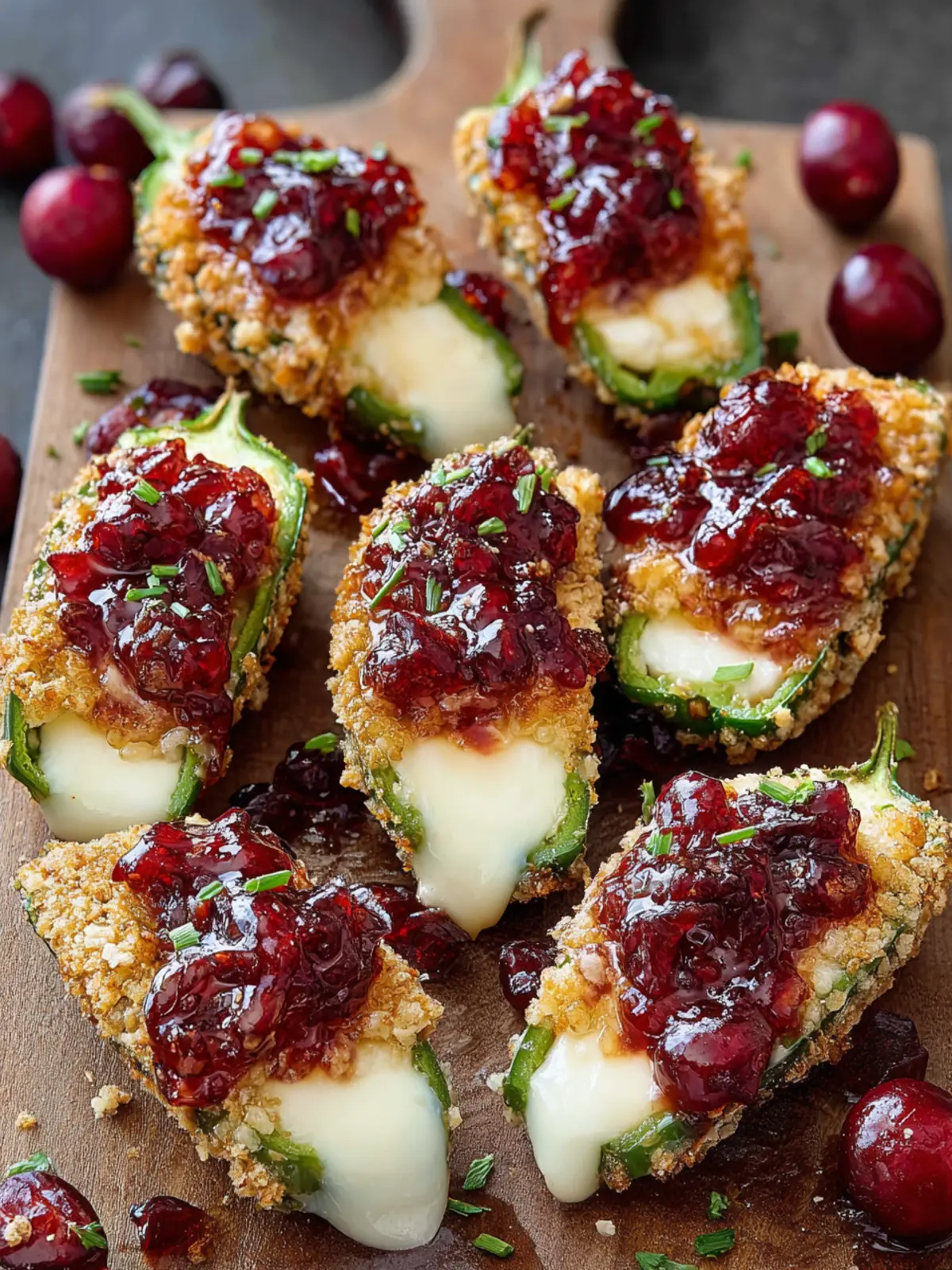 Delicious stuffed jalapeños filled with creamy brie cheese and topped with cranberry sauce.