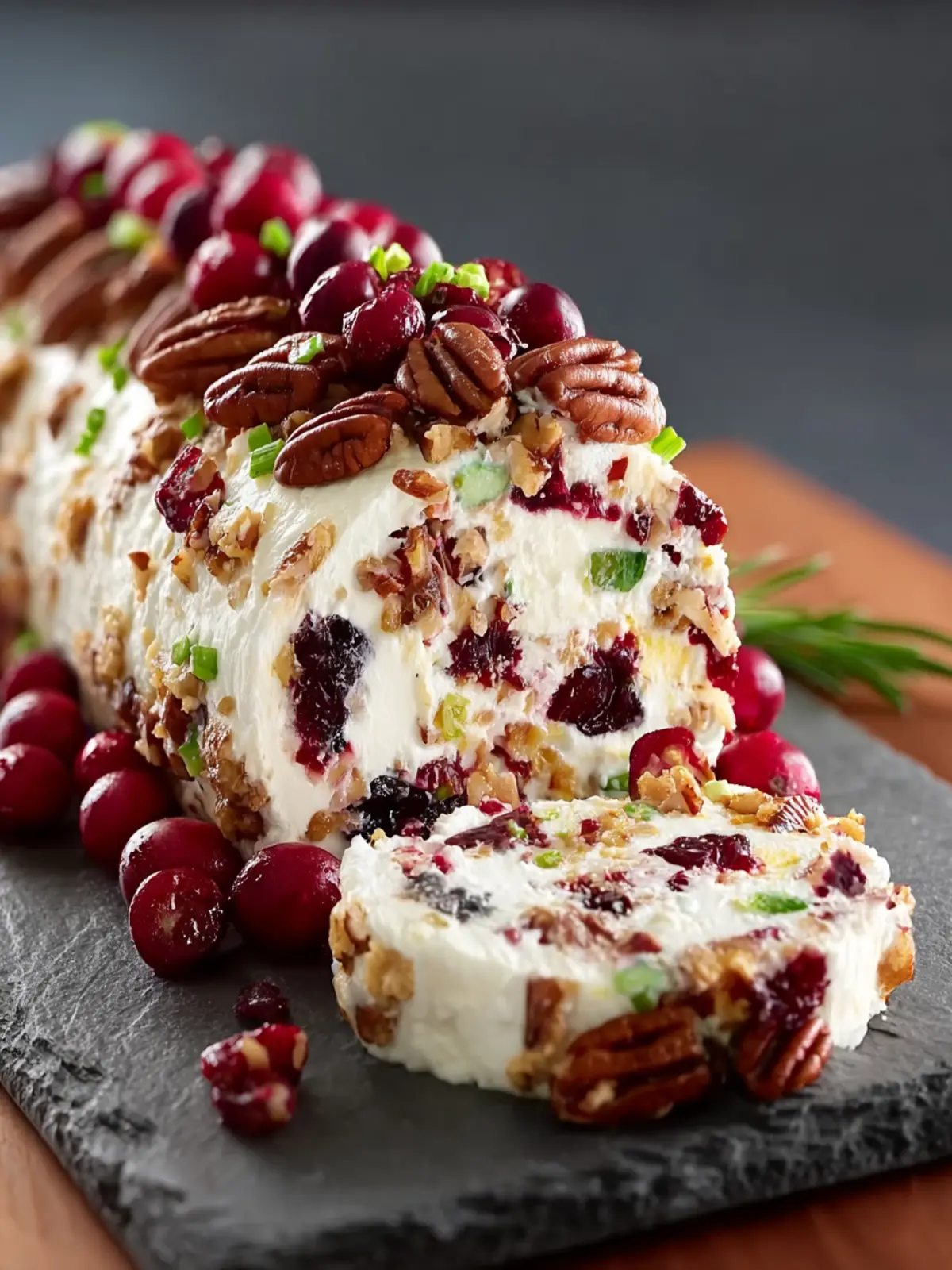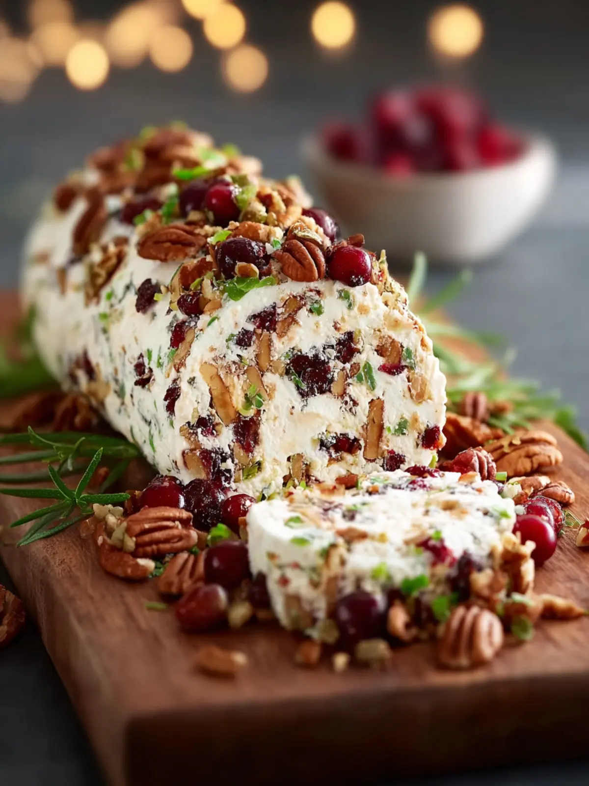 A creamy cheese log coated in cranberries and pecans, perfect for serving with crackers.