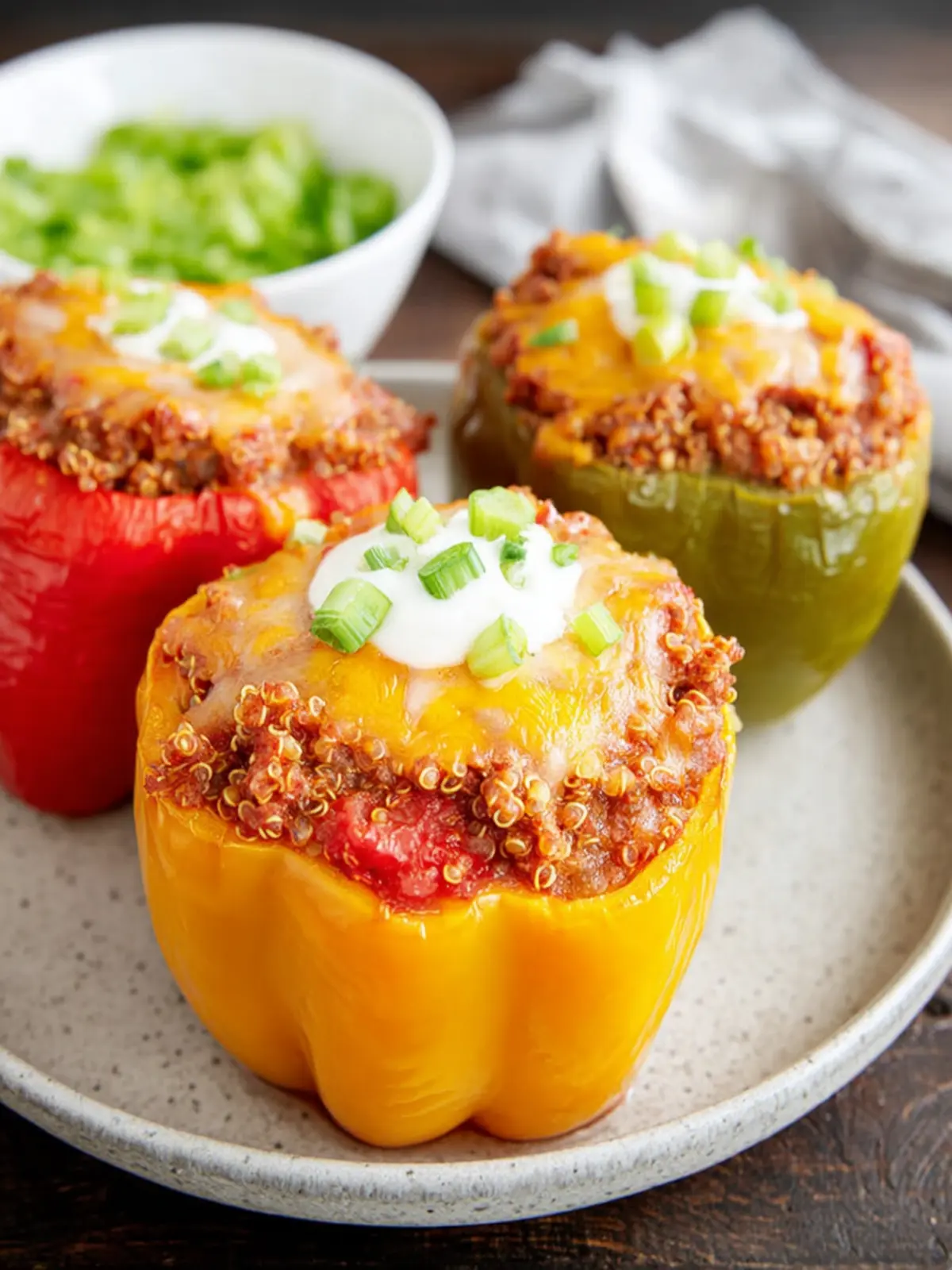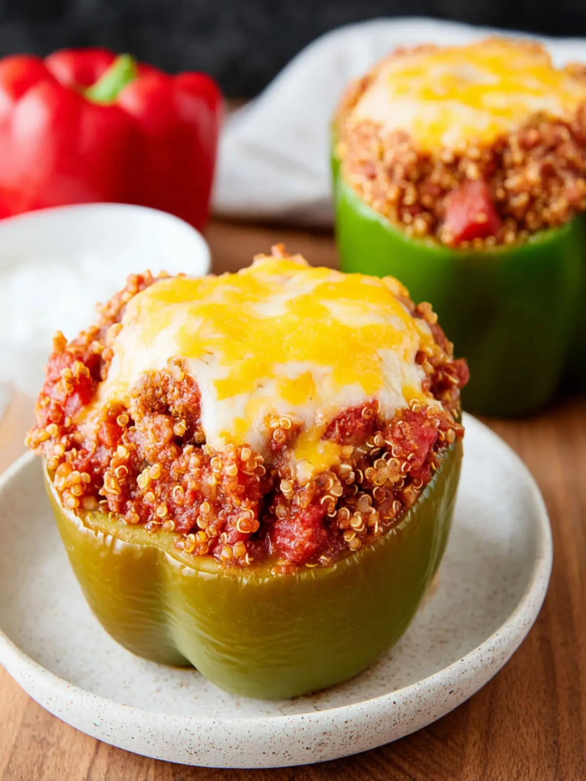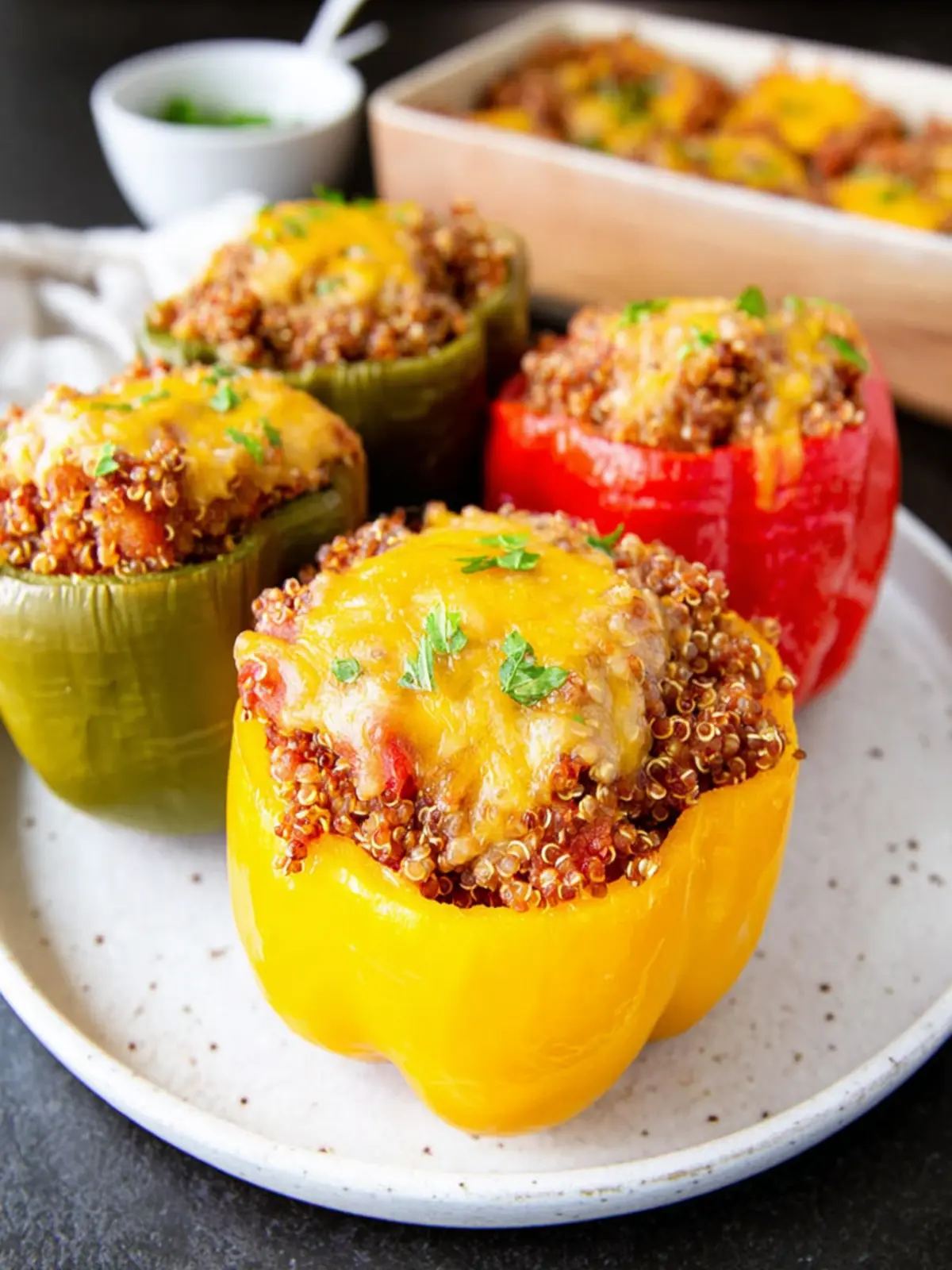Delicious stuffed bell peppers filled with savory ground beef, quinoa, and cheese.