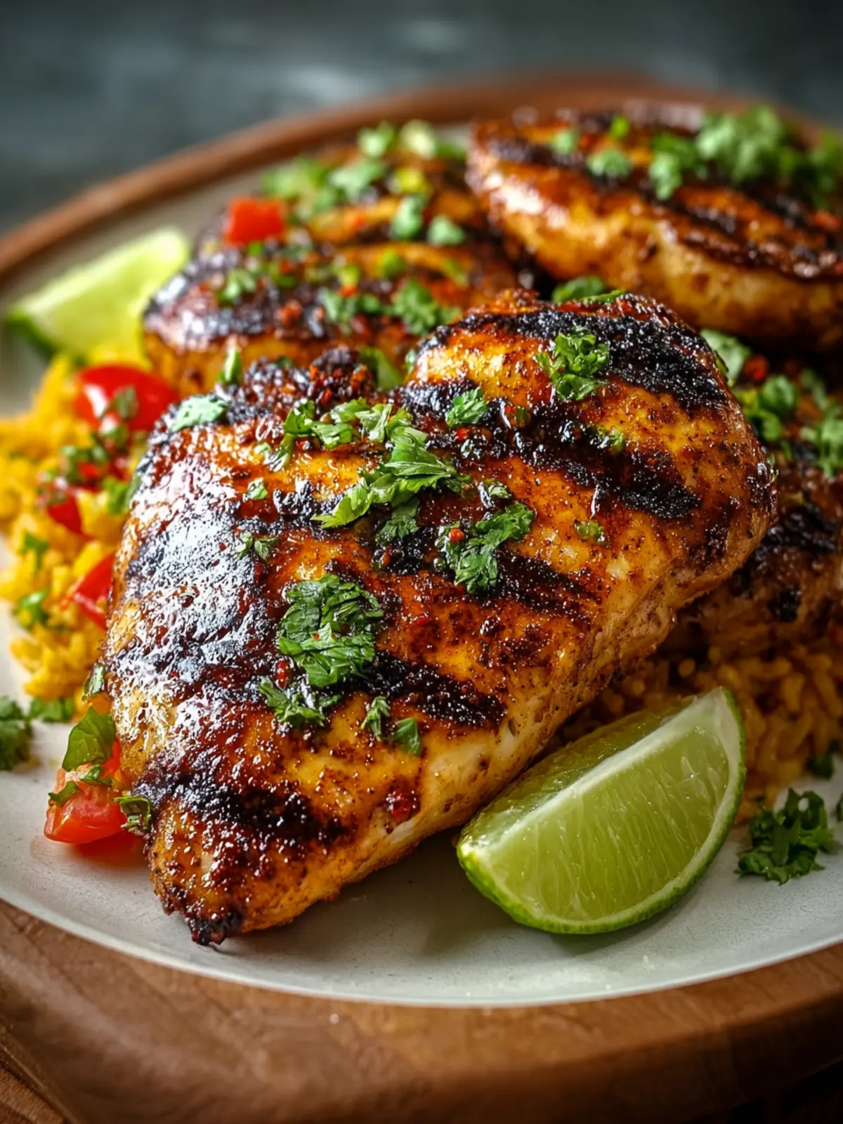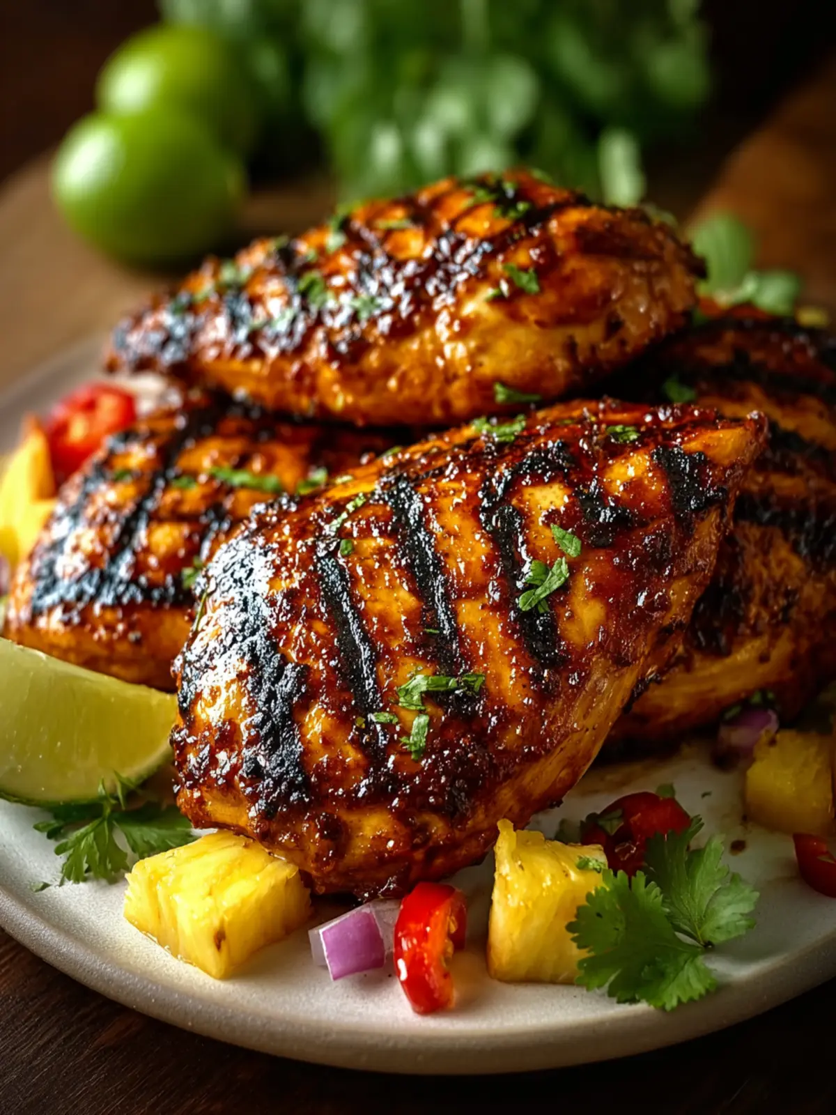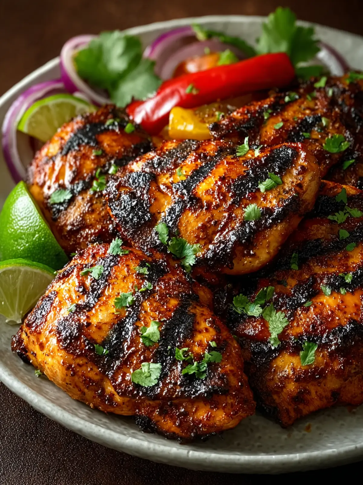 - Transfer the grilled chicken to a platter and let it rest for about 5 minutes. Garnish with fresh cilantro and serve with lime wedges.